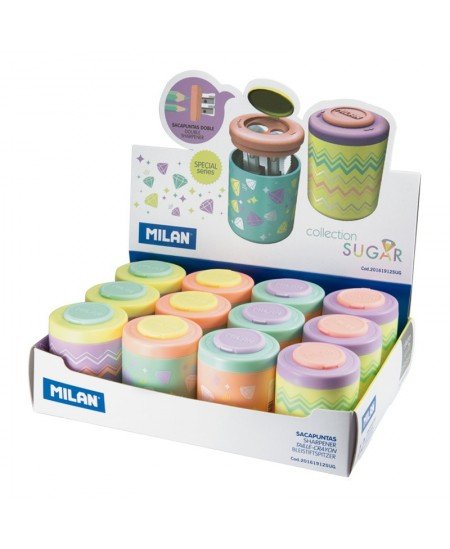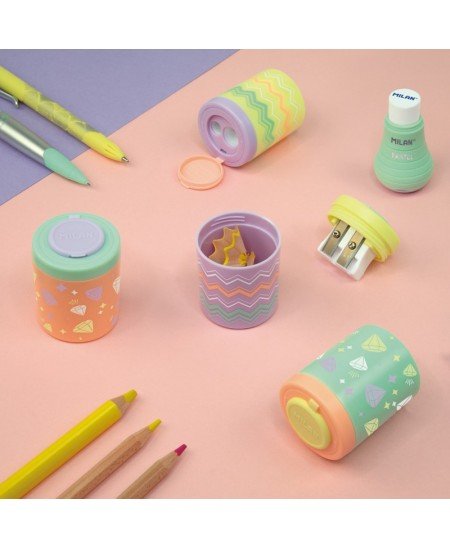 Drožtukas MILAN SUGAR DIAMOND 20 16 1912 SUG. Patogaus naudojimo, su didele talpa susikaupusioms drožlėms laikyti. Dviejų skirtingų dydžių geležtės skirtingo dydžio pieštukams. Drožtuko dizainas įvairių pastelinių spalvų ir deimantų motyvų derinys. Drožtuko dizainas parenkamas atsitiktine tvarka, pasirinkti nėra galimybės.