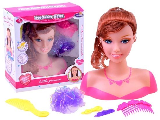 Žavi galva / biustas, norint išmokti šukuoti, kurti gražias šukuosenas, išmokti segti segtukus ir gaminti ponius, puikiai tiks kaip dovana mažajam plaukų stilistui. Dažnai vaikai mėgsta žaisti kirpyklose ir dažnai neturi modelių, norinčių eksperimentuoti su plaukais. Štai kodėl siūlome šią galvą stilizuoti su daugybe mankštos ir grožio priedų.