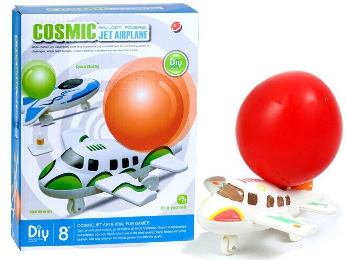Įsivaizduokite, kad kylate kilimo ir tūpimo taku lėktuvu, varomu oro balionais! Šis reaktyvinis lėktuvas tikrai sužadins vaiko vaizduotę, nes jis skrenda veikiamas oro balionų! Ekologiškai mąstančiam vaikui bus malonu tyrinėti įvairius alternatyvius energijos šaltinius. Būsimam inžinieriui patiks kurti lėktuvą ir su juo eksperimentuoti! Aprašymas: Kosminis oro balionu varomas reaktyvinis lėktuvas „Little Treasures“ yra ne tik smagus, bet ir puikus mokymosi įrankis, kuriuo tėvai ir pedagogai gali padėti vaikams! Vaikas pirmiausia gali naudotis paprastomis ir lengvai vykdomomis instrukcijomis, kad surinktų ir nudažytų lėktuvo modelį labai mažai suaugusiojo įsikišimo. Tada jie gali mokytis, kaip naudoti oro balionus reaktyviniam lėktuvui valdyti!